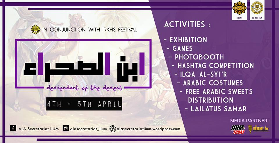 Gombak, 7 April 2017: In conjunction with IRKHS festival, students of Jahili and Islamic Poetry in collaboration with ALA Secretariat IIUM had organised a two-day event called Ibn Al- Sahra: œDescendants of the desert as part of their class project and assignment at Foyer OSC IRKHS.