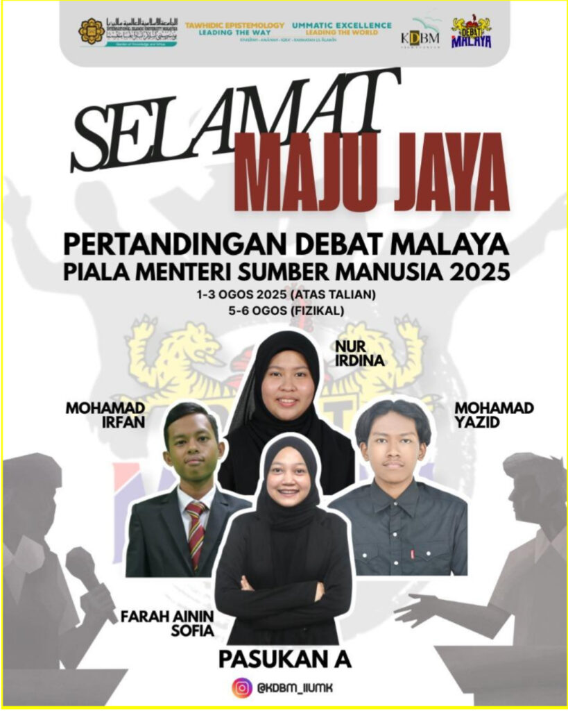 The month of August began with Debat Malaya 2025, a prestigious tournament organised by Universiti Malaya in collaboration with the Ministry of Human Resources (Department of Trade Union Affairs). For this competition, KDBM Pagoh partnered with KDBM Kuantan to send two strong teams under the IIUM Kuantan campus. IIUM Kuantan A performed commendably, ranking 9th out of 22 teams with three victories in the preliminary rounds. The team members were: Sr. Nur Irdina binti Hamka, who shone as Best Speaker in Round 3 against UPTM B. Not to forget, Sr. Farah Ainin Sofiya binti Azizan, who earned Best Speaker in Round 5 against UPM A. Plus, Br. Mohamad Irfan bin Mohamad Faizul, who secured Best Speaker in Round 4 against UMK B. However, the team will not be a good team without the help from Br. Mohamad Yazid bin Ahmad, as he was the fourth debater for the team.