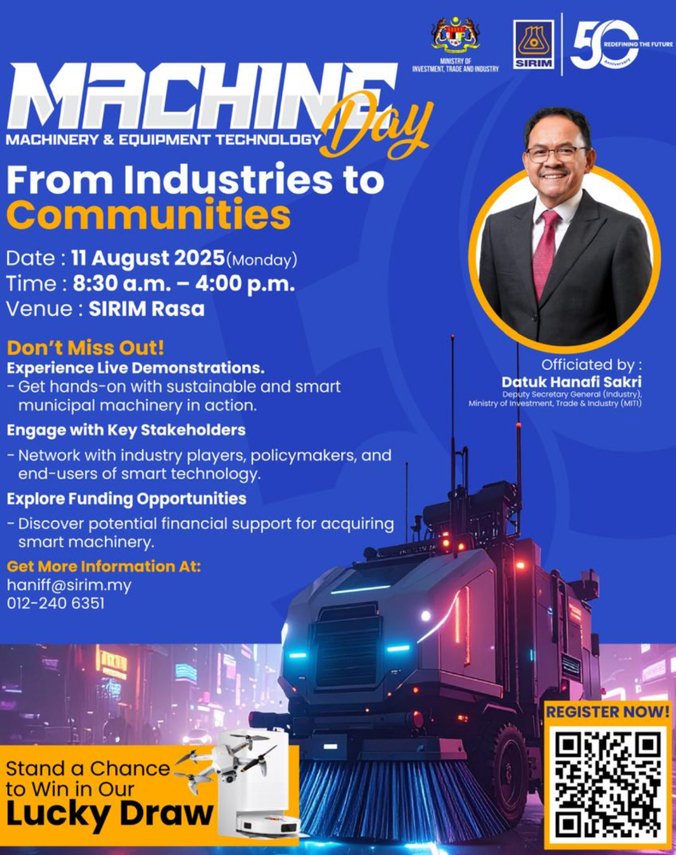On 11 August 2025, SIRIM hosted Machine Day at Kawasan Perindustrian Rasa, Hulu Selangor, carrying the theme “Machinery and Equipment Technology: From Industries to Communities.” The programme, officiated by Datuk Hanafi Sakri, Deputy Secretary General (Industry) of the Ministry of Investment, Trade and Industry (MITI), offered more than just an exhibition, it created a space where ideas, technology, and people came together with a shared vision of progress.