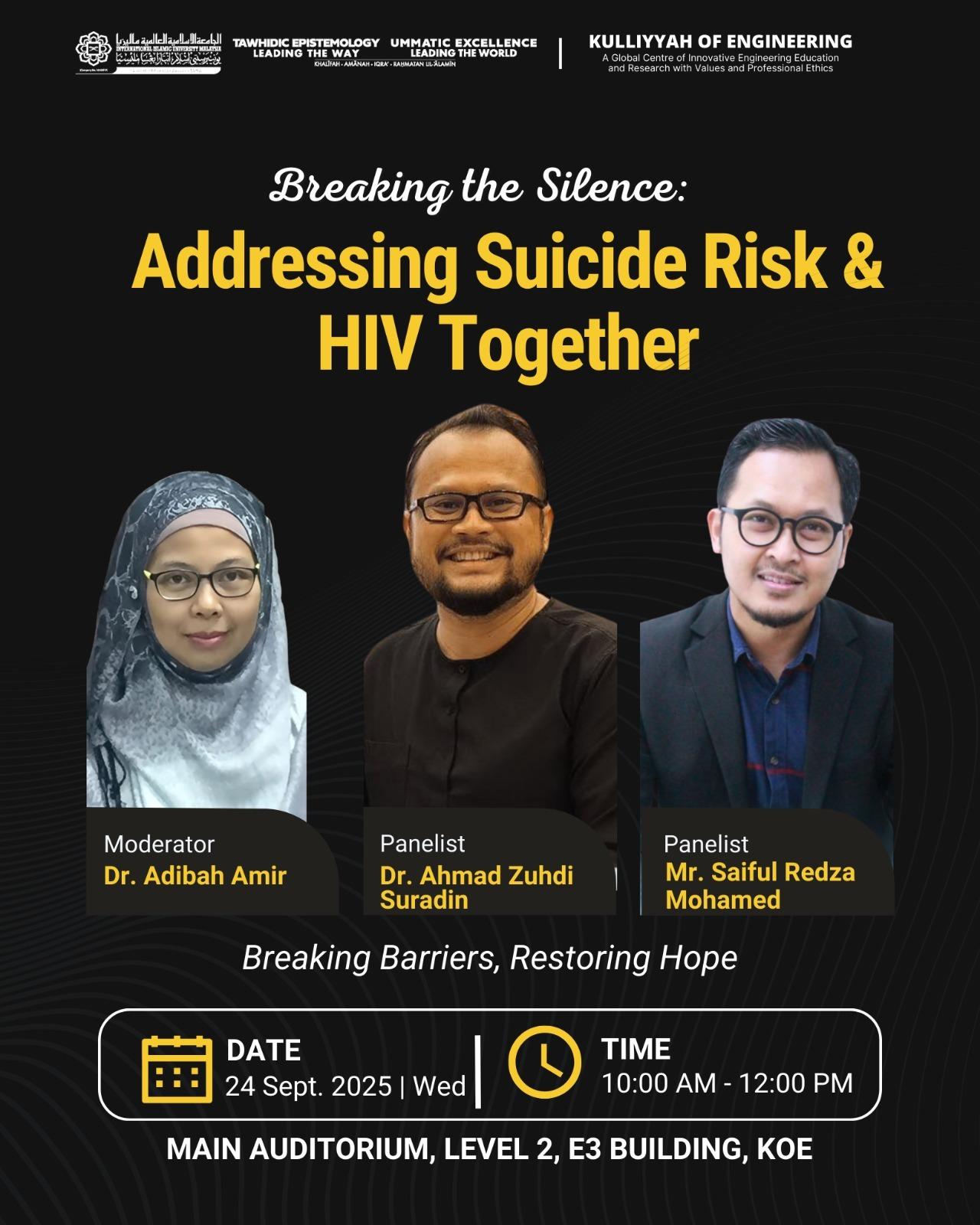 The Kulliyyah of Engineering (KOE), International Islamic University Malaysia (IIUM), held an insightful forum titled “Addressing Suicide Risk and HIV Together” at the Main Auditorium on 24th of September 2025, bringing attention to two critical public health issues, peeling back the layers of stigma that make discussions on suicide and HIV so often shrouded in silence.