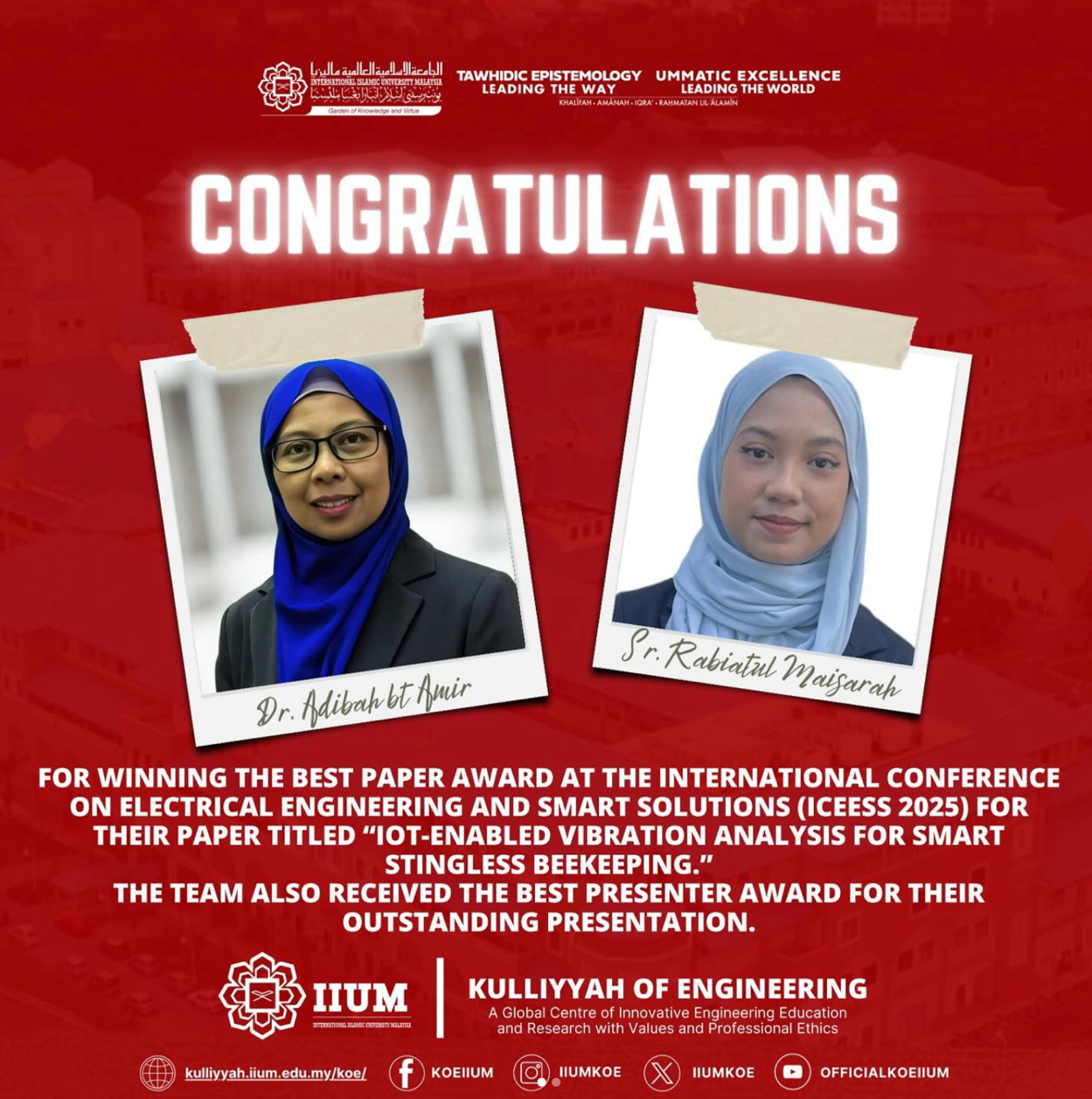 A research paper titled “IoT Enabled Vibration Analysis for Smart Stingless Beekeeping” by Rabiatul Maisarah Binti Firdausthul Ahmad Sufian, Dr. Adibah Binti Amir, and Dr. Tuan Ahmad Zahidi Bin Tuan Abdul Rahman won both the Best Paper Award and Best Presenter Award at the 1st International Congress on Green Engineering and Sustainable Development (ICoGESD).