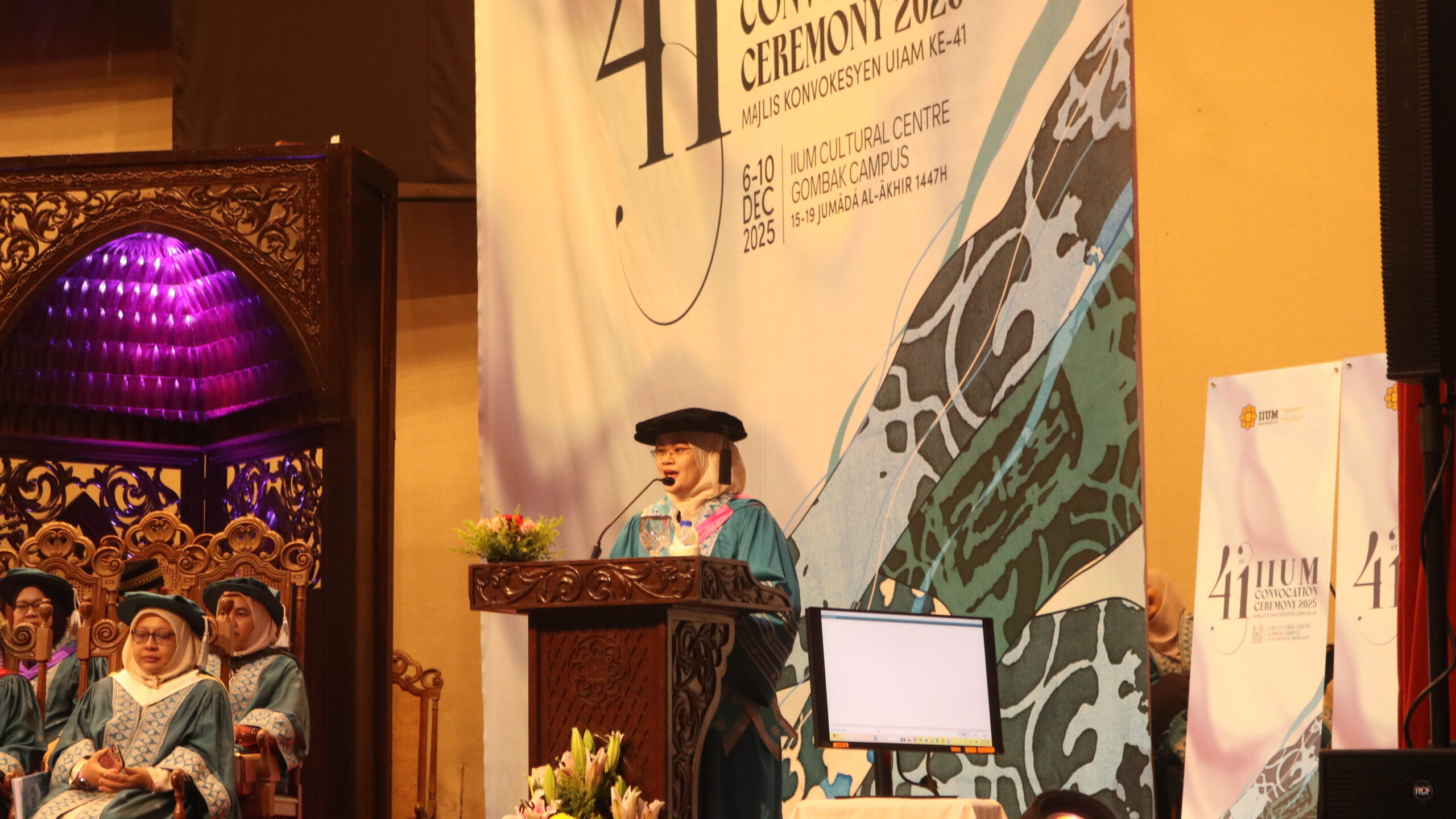 GOMBAK, 6 December 2025: Dr Maryam Syahidah Binti Azlan, a graduate from Kulliyyah of Allied Health Science, delivered the valedictorian speech and honoured the hard work of all the graduates in the first session of the 41st IIUM convocation at the Main Hall of IIUM Cultural Centre (ICC).