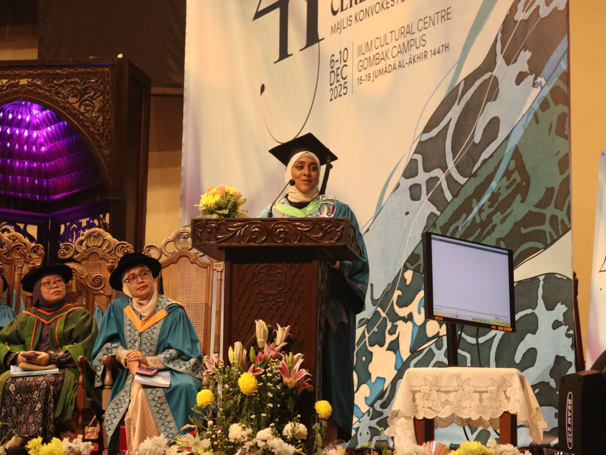 GOMBAK, 10 December 2025: Hassan Fadwa Ramadan Ali from Egypt took center stage at the eighth session of 41st IIUM Convocation Ceremony 2025 at the Main Hall of IIUM Cultural Center (ICC), IIUM Gombak Campus. As the valedictorian of the Kuliyyah of Information and Communication Technology (KICT), she captivated the audience with a speech about her journey and the lessons that shaped her experience at IIUM.