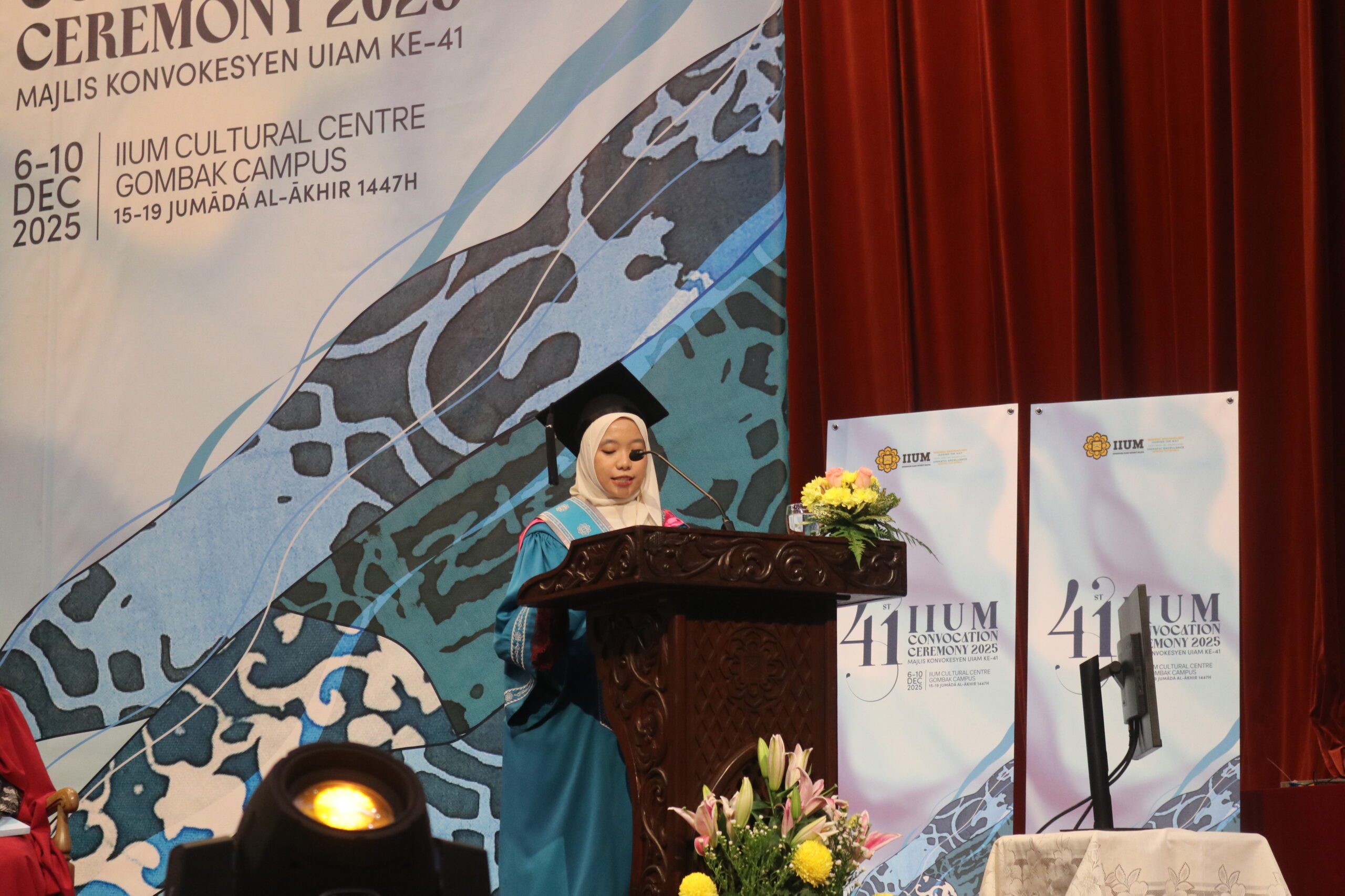 GOMBAK, 9 December 2025: Bachelor of Physiotherapy (Honours) graduate from Kulliyyah of Allied Health Sciences (KAHS), Alia Aqilah Binti Isnin delivered the valedictorian speech in the sixth session of the 41st IIUM Convocation Ceremony, calling on graduates to uphold Islamic values as they will begin their professional journey.