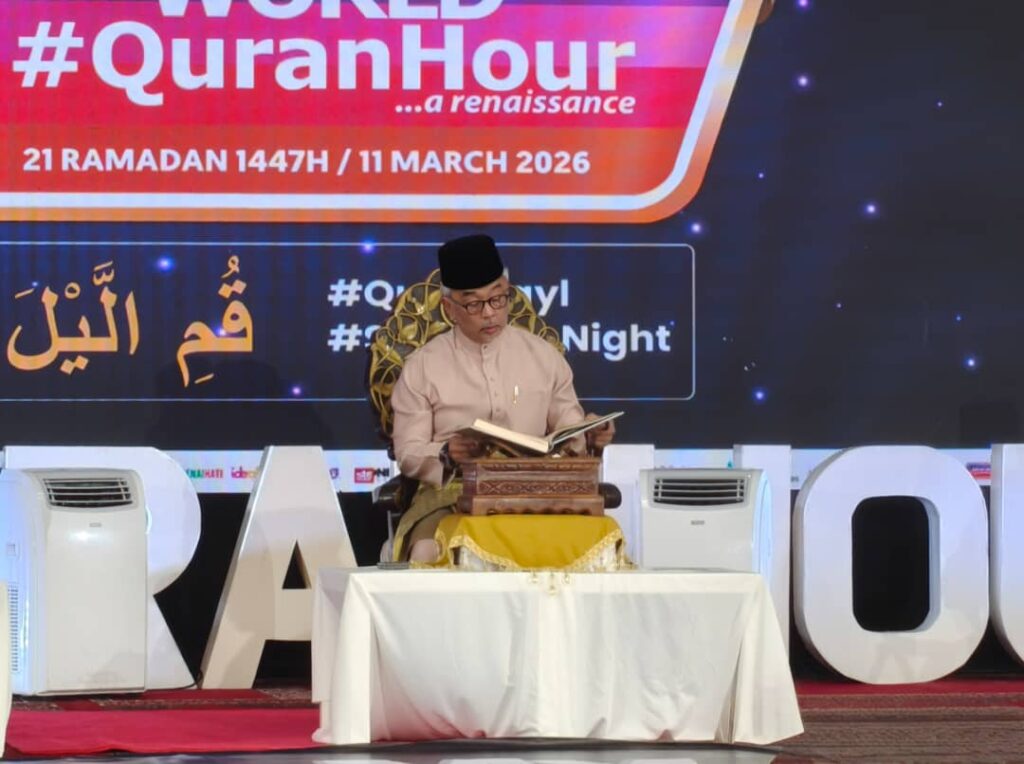 Picture shows The Sultan of Pahang recites the Quran from the seat of honour during the World #QuranHour 2026