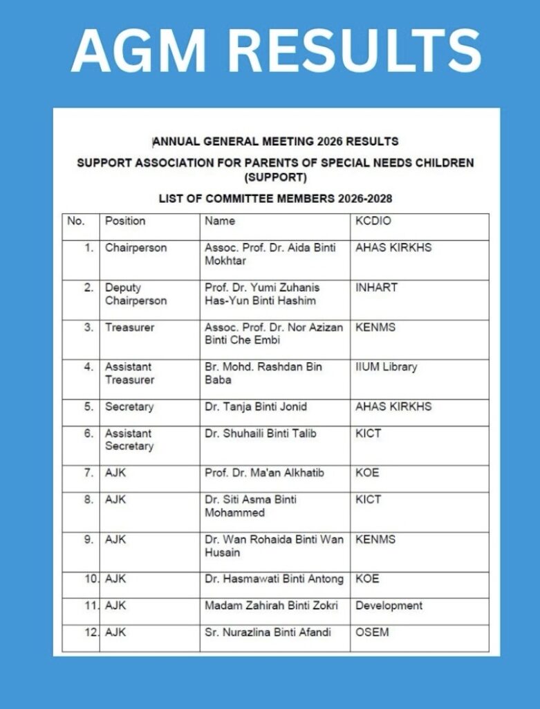 IIUM’s Support Association for Parents of Special Needs Children (SUPPORT) had its second annual general meeting (AGM) on 10 April, using a hybrid format thus producing a new lineup of committees for 2026 to 2028.
