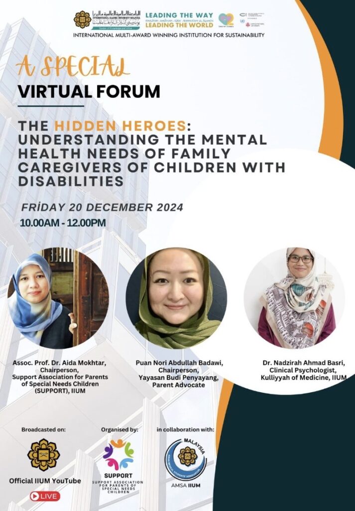 - 2024: SUPPORT organised several webinars featuring the chairperson of Yayasan Budi Penyayang, Puan Nori Abdullah Badawi, IIUM clinical psychologist, Dr. Nadzirah Basri and I, on parents of special needs children as hidden heroes. This webinar was organised in collaboration with Asian Medical Students’ Association Malaysia (AMSA) and Assoc. Prof. Dr. Khairil Hussaini Jamil of IIUM on the Islamic framework of disability inclusion.